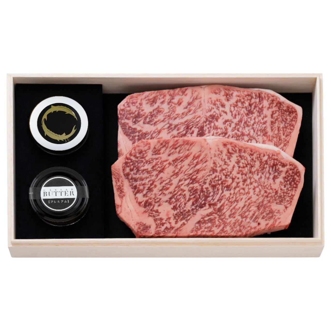 鮮やかな霜降りの千屋牛サーロインステーキと新見フレッシュキャビア、新見キャビアバターのセットです。お箸で切れるほどの柔らかいステーキと濃厚なバター・しっとりとしたキャビアの豪華なハーモニーをお楽しみください。